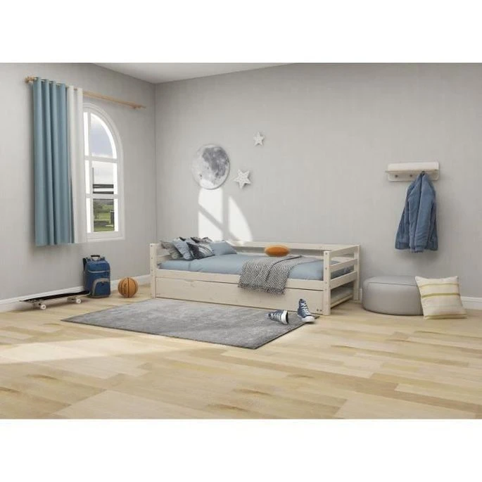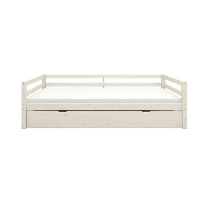 SOREN Lit banquette gigogne enfant – Structure en bois Pin massif – Coloris : Blanchie – Sommiers a lattes inclus