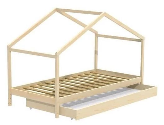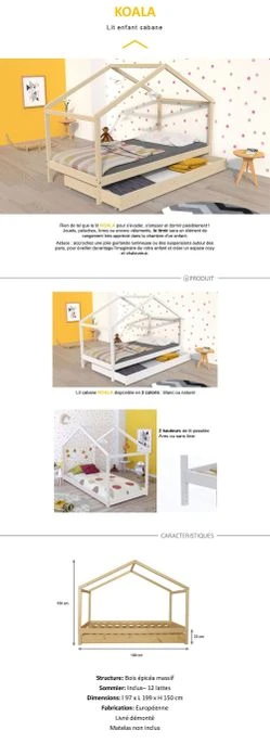 KOALA Lit cabane enfant avec tiroir – Bois Epicéa massif – Coloris : Naturel – Sommier 12 lattes inclus – Vendu sans matelas