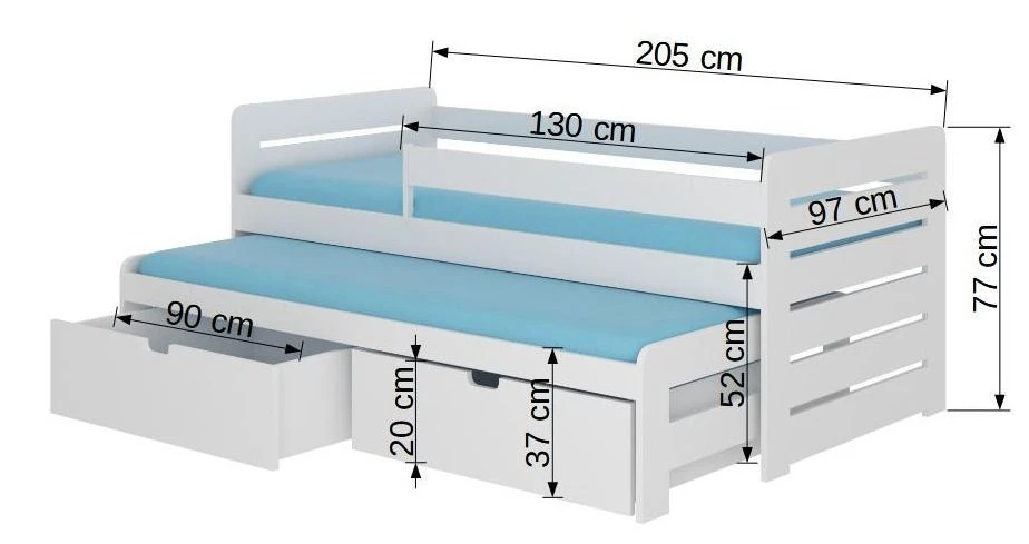 Le lit du bas et les 2 coffres de rangement sur roulettes se glissent sous le lit du haut, offrant ainsi un espace de couchage supplémentaire sans encombrer la chambre. Ces 2 couchages de 90×200 cm permettent à vos enfants de dormir confortablement et en toute quiétude, offrant également la possibilité d’accueillir un ami pour une nuit paisible.