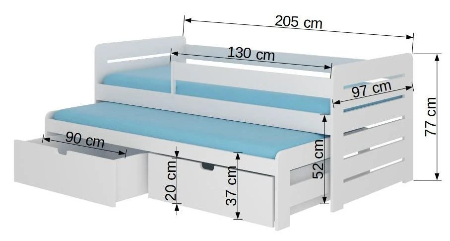 Le lit du bas et les 2 coffres de rangement sur roulettes se glissent sous le lit du haut, offrant ainsi un espace de couchage supplémentaire sans encombrer la chambre. Ces 2 couchages de 90×200 cm permettent à vos enfants de dormir confortablement et en toute quiétude, offrant également la possibilité d’accueillir un ami pour une nuit paisible.