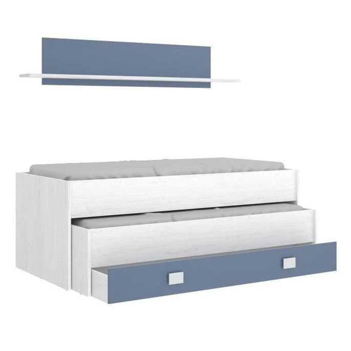 OCEAN Lit gigogne enfant – Décor Chêne blanc/bleu – 1 Tiroir de rangement + 1 étagère – Structure en panneaux de particules mélaminés