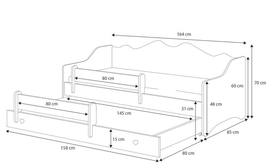 Offrez à votre enfant un univers féérique avec notre lit gigogne enchanté. Doté d’un couchage spacieux de 80×160 cm, ce lit est orné d’un élégant liseret rose qui encadre le contour du lit, agrémenté de délicats petits cœurs roses pour une touche de magie.
