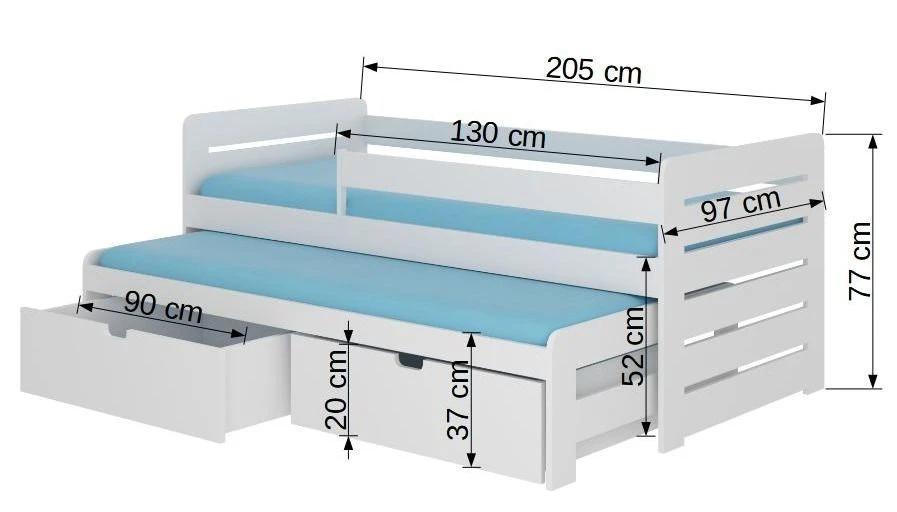 Le lit du bas et les 2 coffres de rangement sur roulettes se glissent sous le lit du haut, offrant ainsi un espace de couchage supplémentaire sans encombrer la chambre. Ces 2 couchages de 90×200 cm permettent à vos enfants de dormir confortablement et en toute quiétude, offrant également la possibilité d’accueillir un ami pour une nuit paisible.