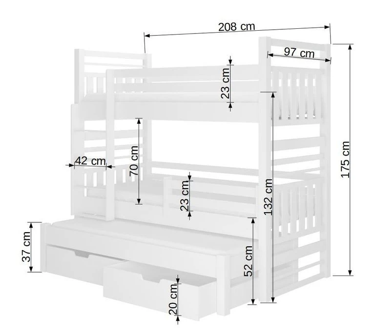 Il est équipé d’une echelle facile d’accès, ainsi que de deux grand tiroirs de 100 x 80 x 20 cm chacun pour ranger des affaires.