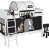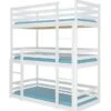 Le lit dispose de trois niveaux, ce qui permet d’optimiser l’espace disponible en hauteur. Chaque niveau est équipé d’un sommier à lattes qui offre un excellent confort de couchage. Les barrières de sécurité sur les côtés du lit assurent la sécurité des enfants et leur permettent de dormir en toute tranquillité.