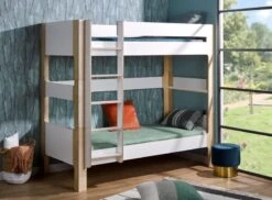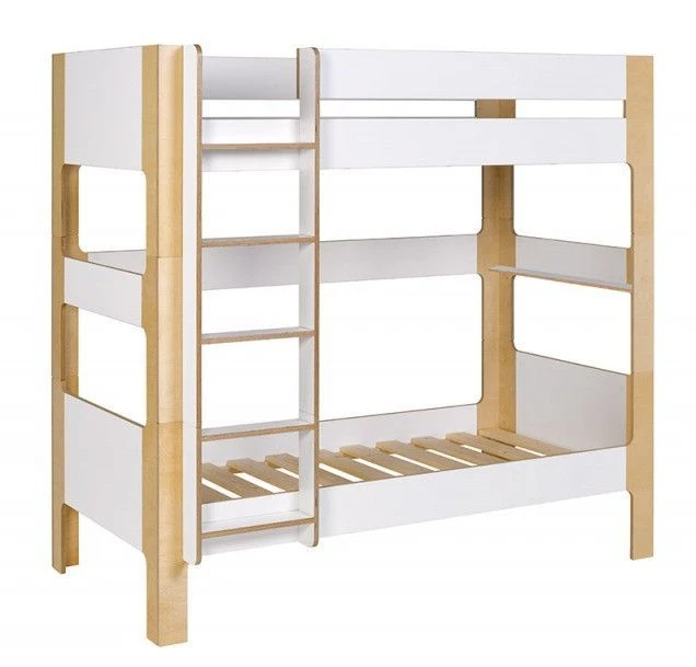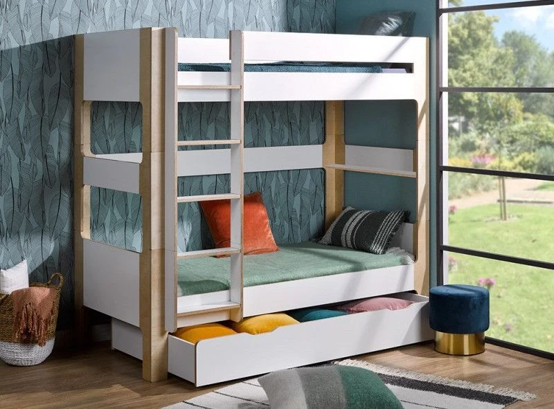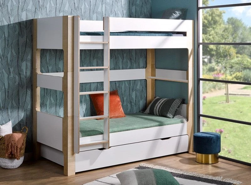 Fabriquée en bois MDF blanc et décor bouleau clair, sa structure est séparable en 2 lits quand vos bouts de chou voudront être indépendants, vous pouvez aussi le séparer en un lit simple et un lit mi-hauteur pour agencer la chambre à votre guise. En retirant le sommier du bas, vous aurez un lit mezzanine.