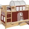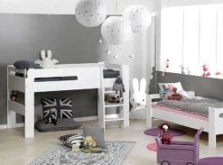 Fabriqué en bois MDF blanc et décor bouleau clair, sa structure peut être séparée en 2 lits simples, vous pouvez aussi le moduler pour avoir un lit simple et un lit mi-hauteur. En retirant le sommier du bas, vous aurez un lit mezzanine et un aire de jeu ou de travail.
