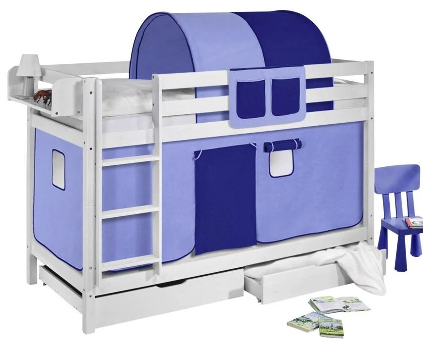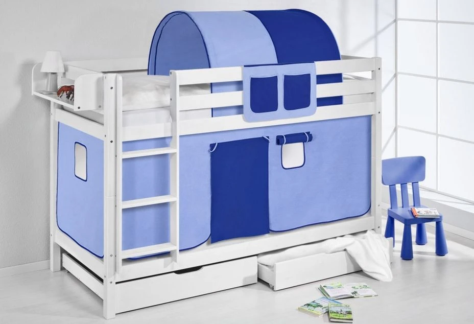 En option, le tunnel, l’étagère, les matelas mousse (de fabrication Européenne épaisseur 14 cm )et le set de 2 tiroirs L 185 x L 85 x H 23 cm par tiroir et étagère L 80 cm.