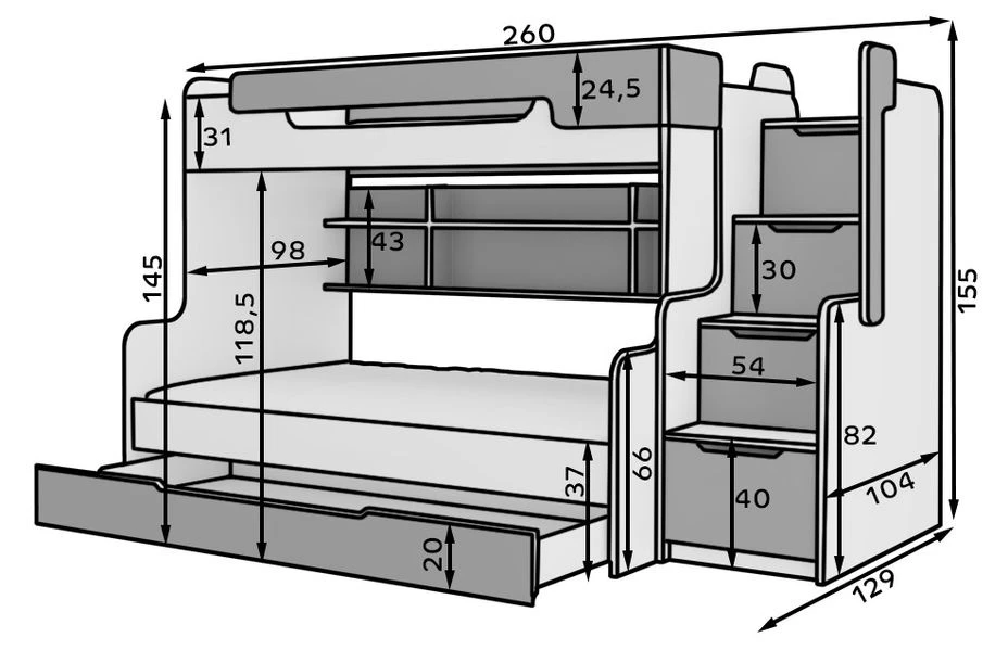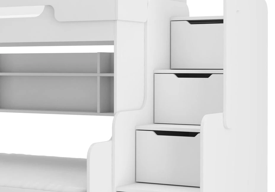 En plus de fournir trois places pour dormir confortablement, ce lit superposé intègre un ingénieux système de rangement. L’escalier qui mène aux couchages supérieurs est également équipé de casiers pratiques, vous offrant ainsi un espace supplémentaire pour ranger livres et jouets en toute facilité.