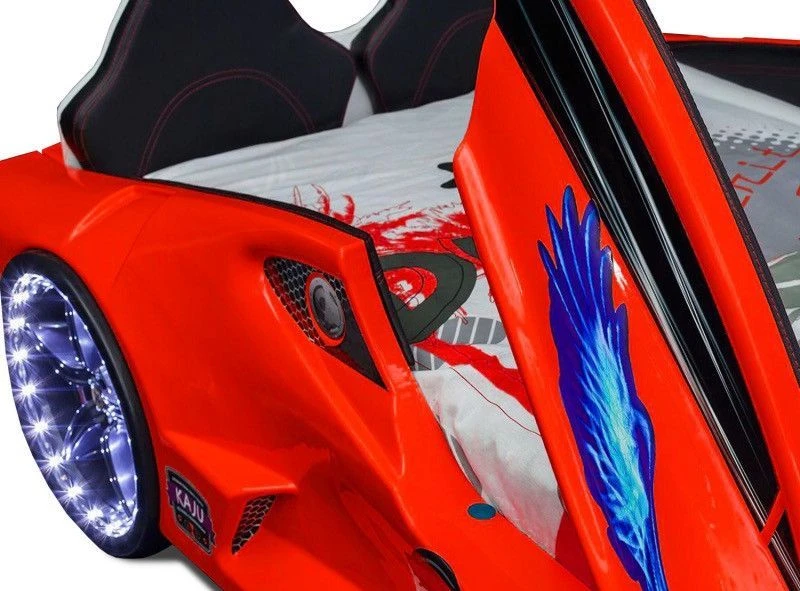 Garniture rembourée simili cuir et spoiler arrière, 3 bruitages différents.